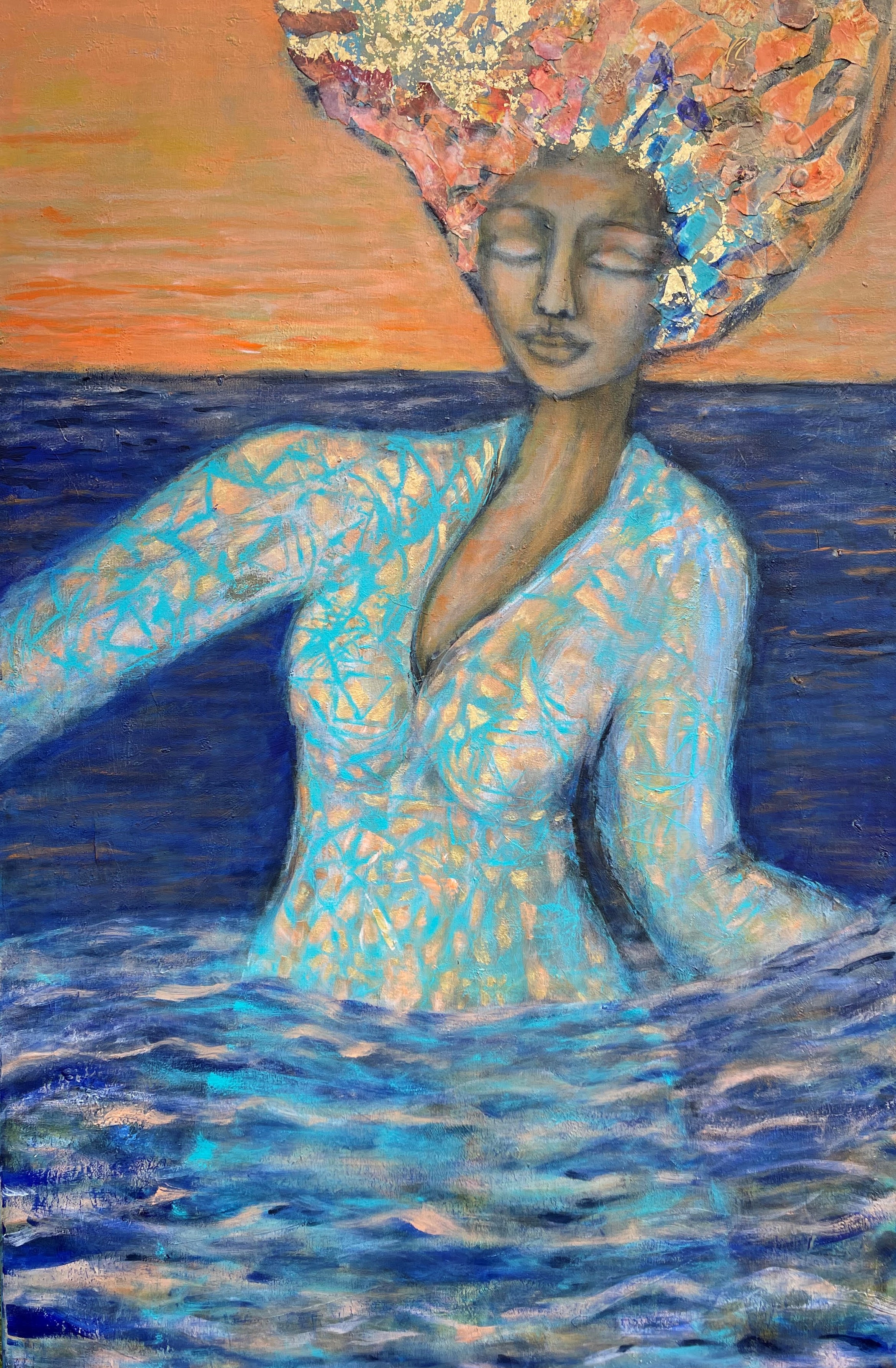 Ik had in haar hoofdtooi metallic goudpapier verwerkt, maar kon pas verder toen ik bladgoud had gekocht.