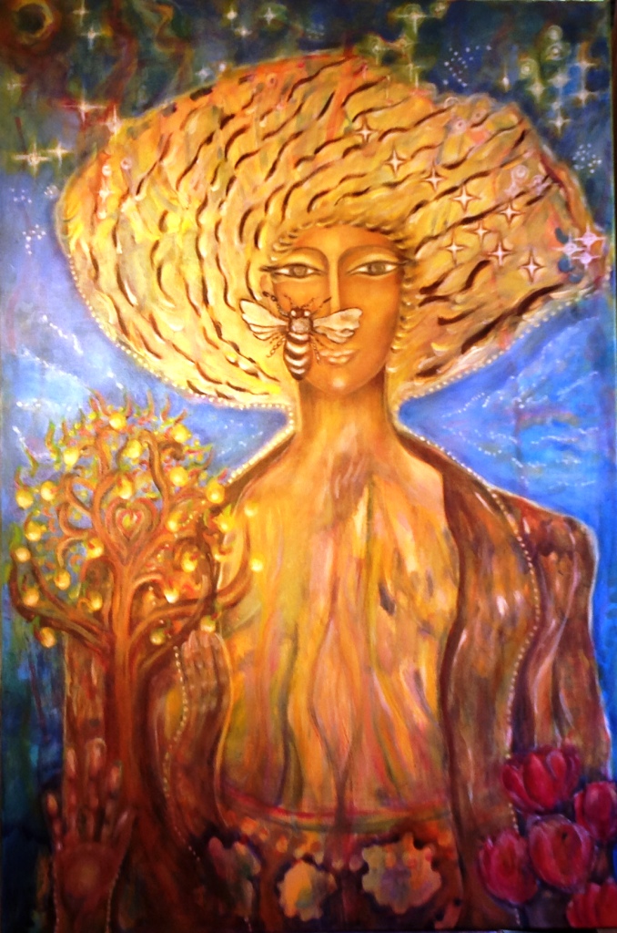 Met dit schilderij van de Moeder van het universum ben ik een heel jaar bezig.