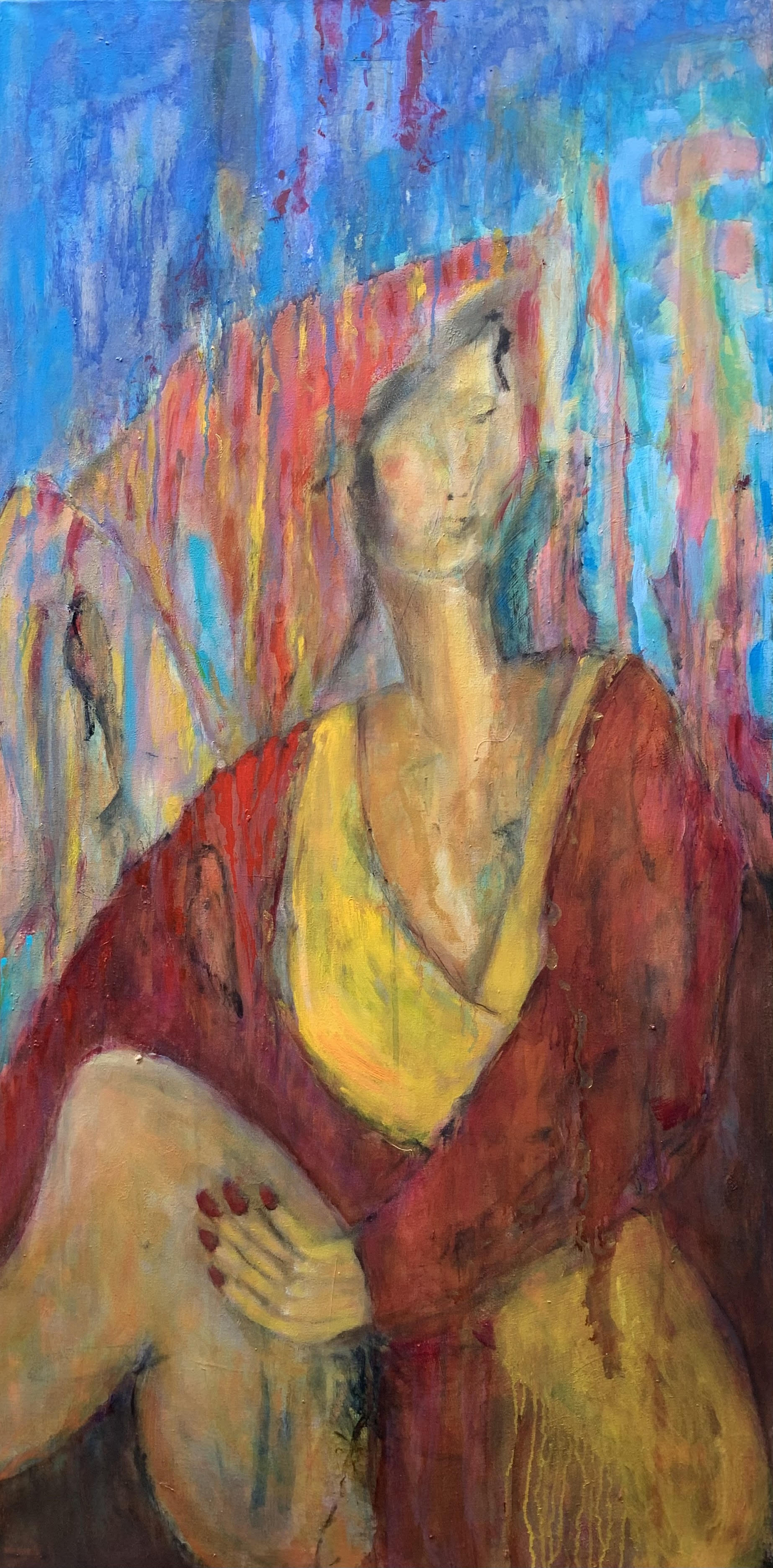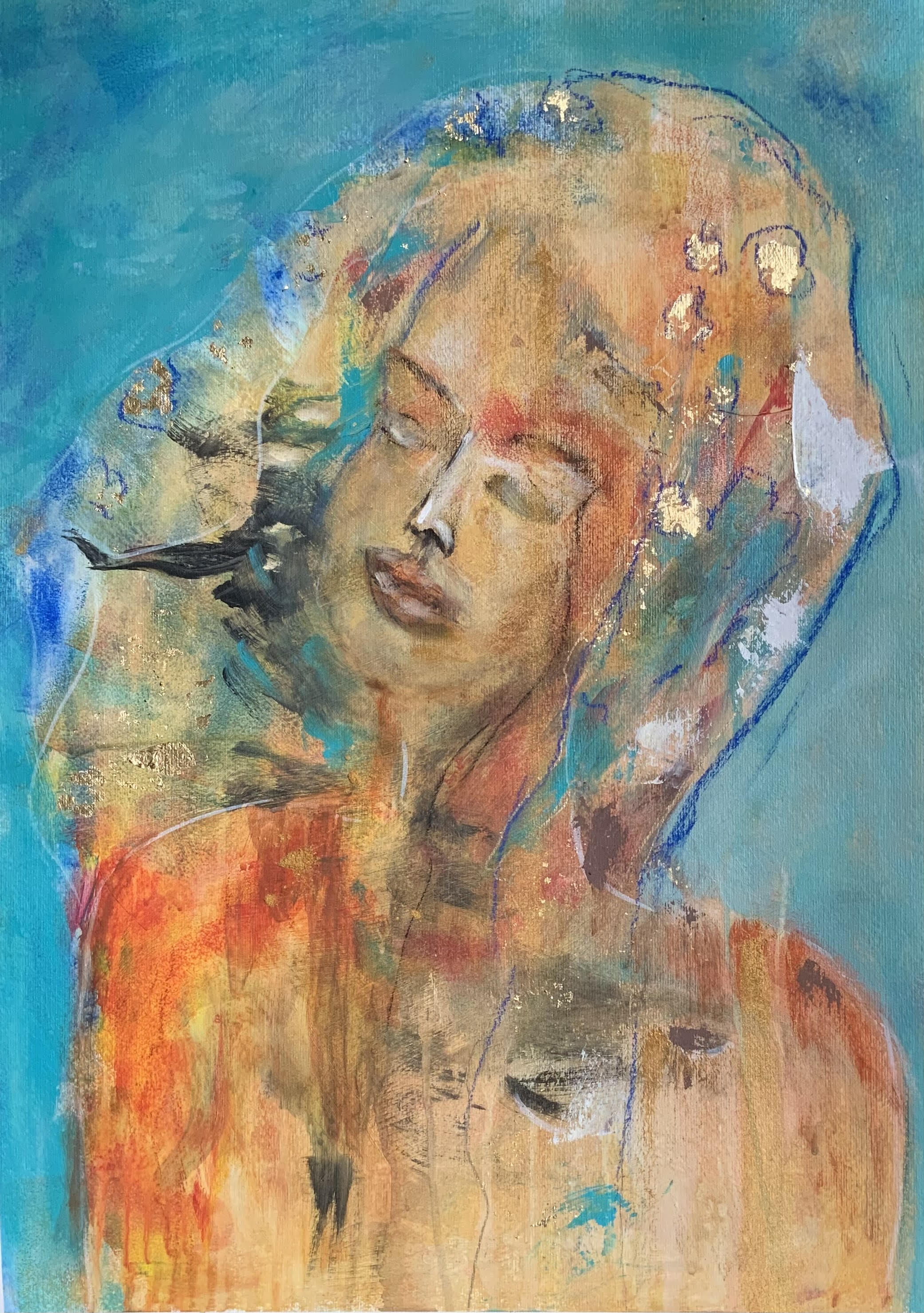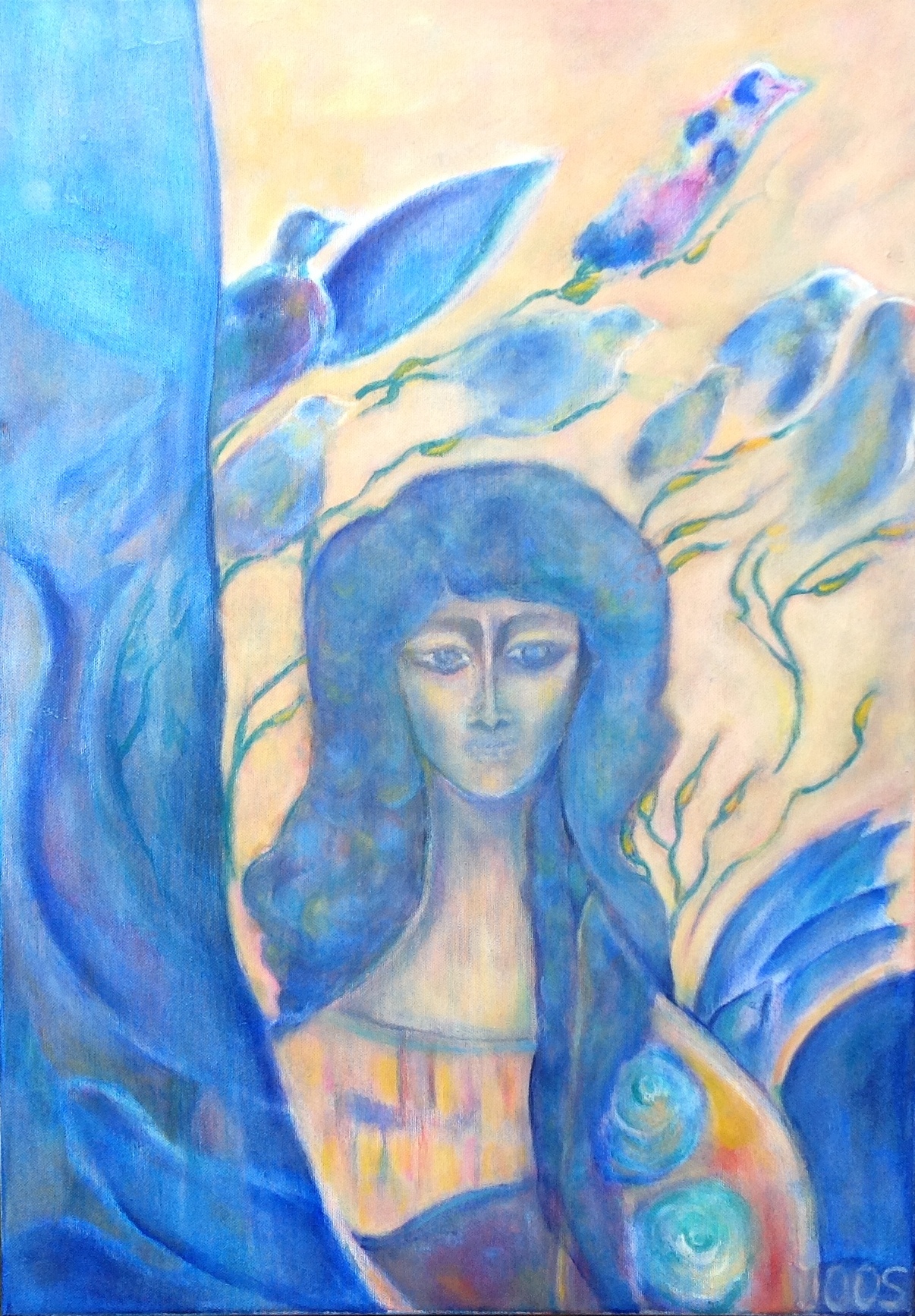 Bij het maken van dit schilderij wilde ik graag veel bloemen om haar heen schilderen, maar in plaats daarvan verschenen vogels en vissen.